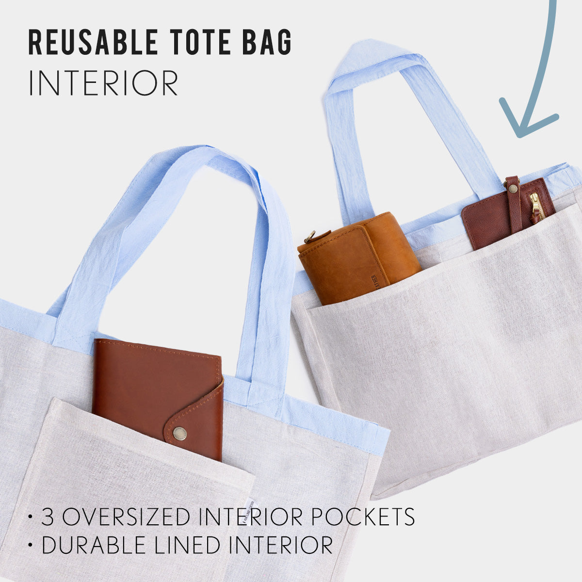 - For a quick trip to the Farmer's market, or a day at the beach our lined Reusable Tote Bag is the perfect fit