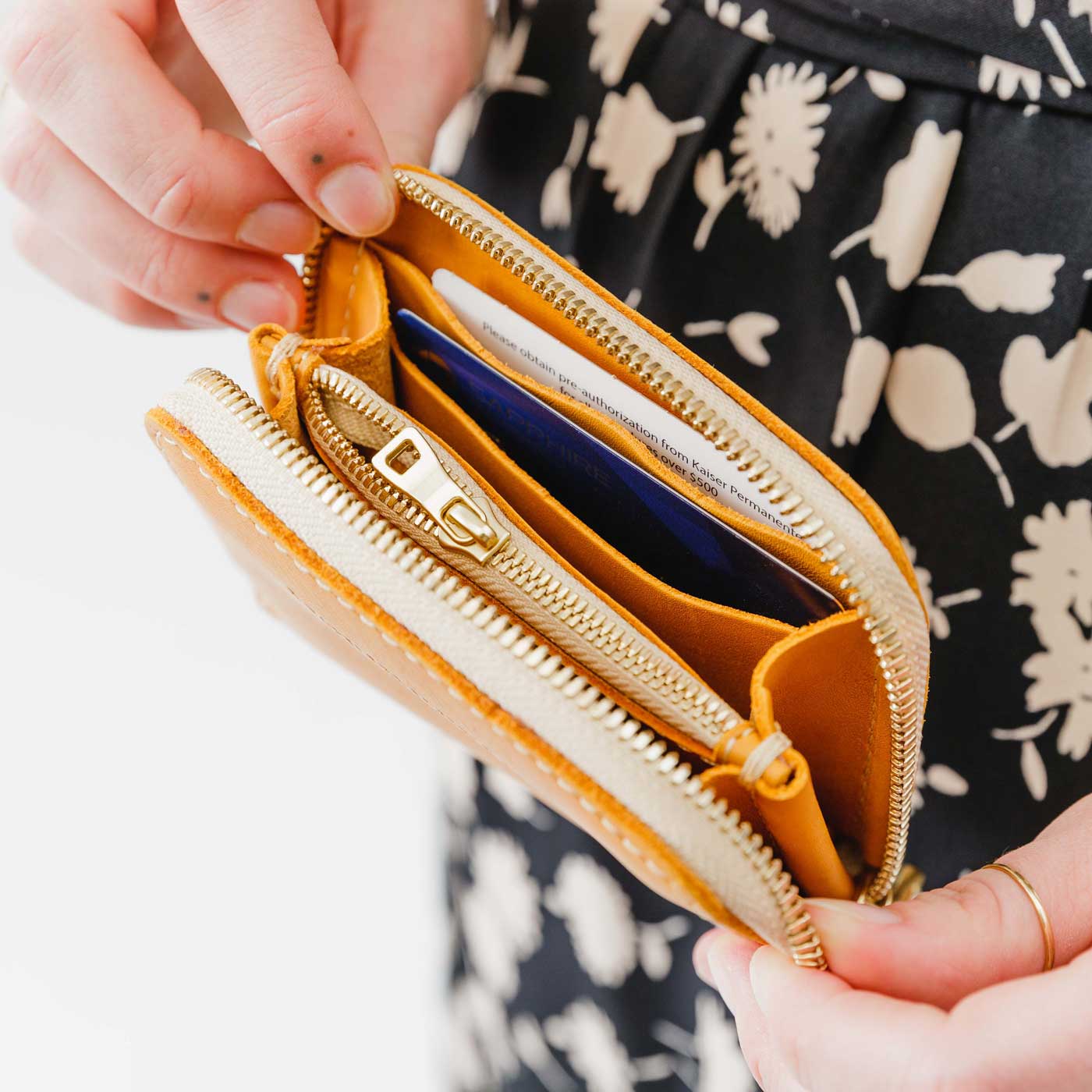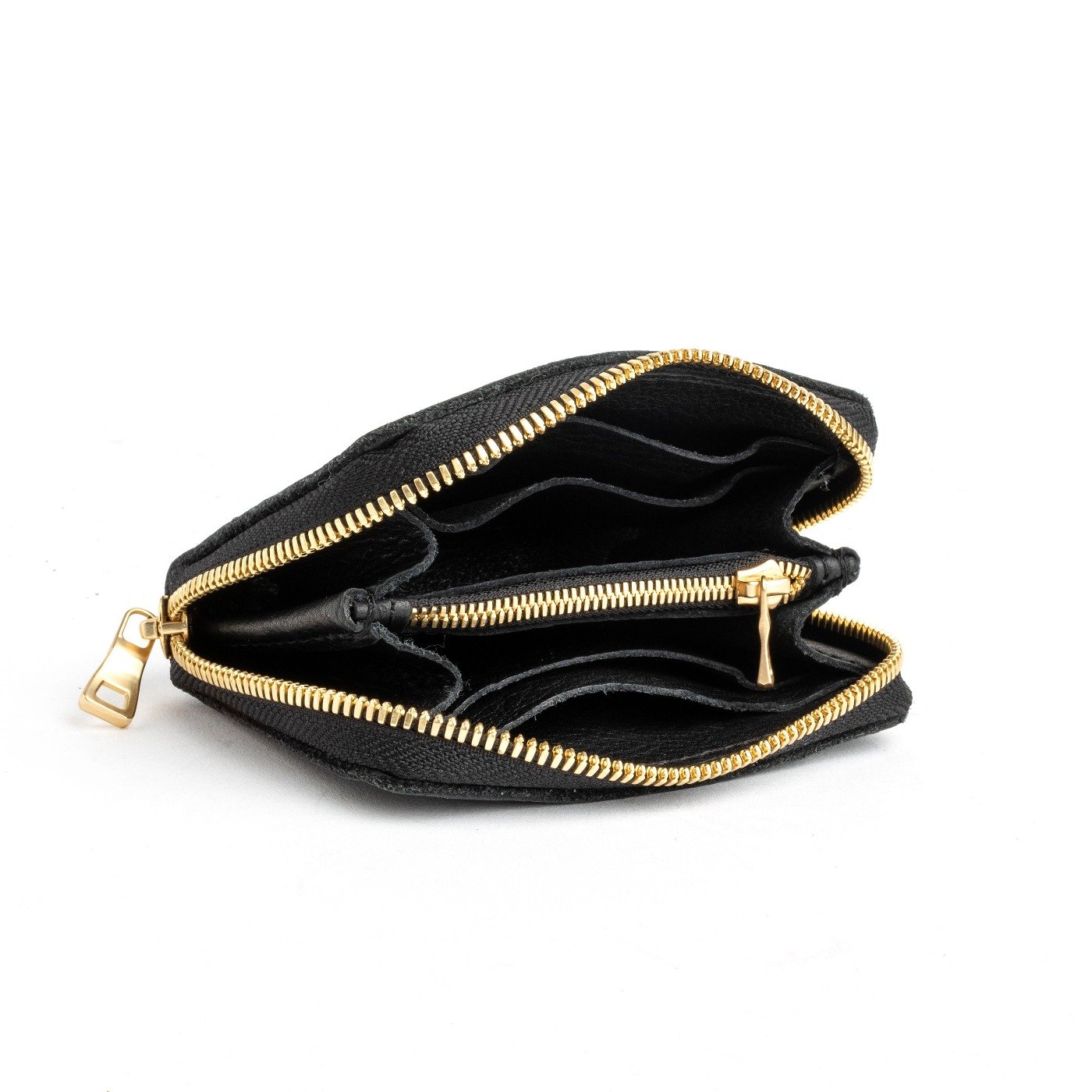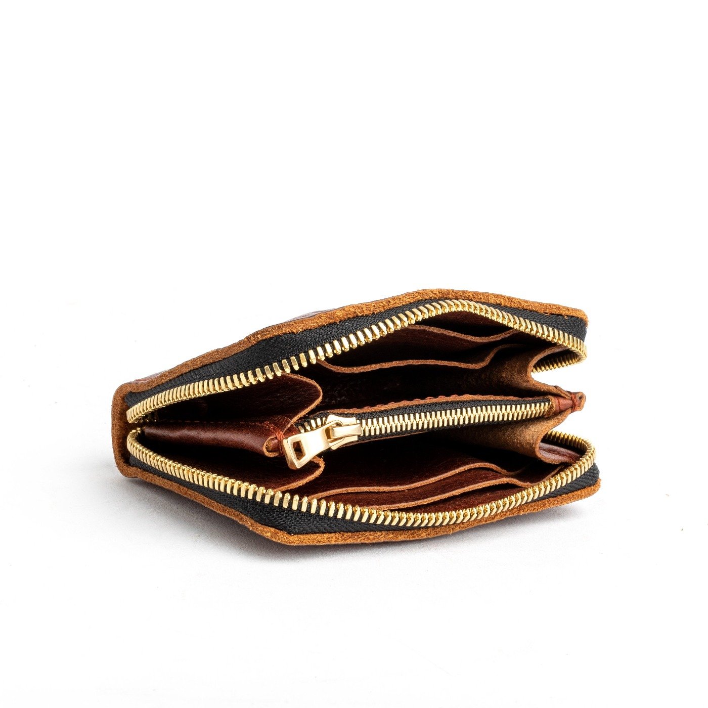 - 4 card slots, 2 large pockets for cash, and a zippered coin pocket